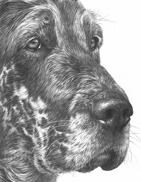 Giclee print of a beautiful pencil drawing of the ever loyal English Setter. The owner of this English Setter graciously allowed me to use this photograph, as I couldn't personally find and photograph a comparable dog. Unknown to me scratchboard artist Ray Russell used the photograph too but our versions complimented each other rather than competed. The drawing took approximately 83 hours to complete.Fantastic detail in this brand new and official print, which has never been put on a wall. Every hair on the dog seems to have been drawn.