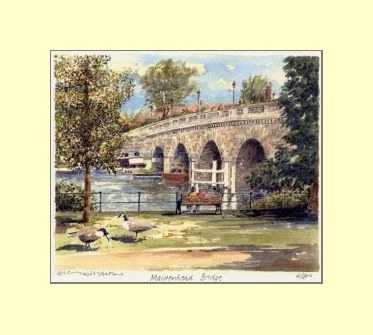 Picturesque scene of Maidenhead Bridge, Berkshire by Philip & Glyn Martin, the talented artists, known for their finely detailed watercolour paintings.